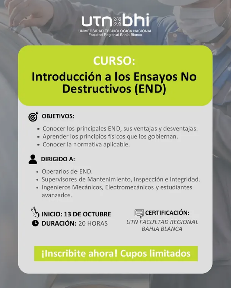 Este curso de Introducción a los END está destinado a supervisores/as de inspección y/o mantenimiento de empresas de tercera categoría, personal de empresas de servicio relacionadas con END, estudiantes de los dos últimos años de carreras de ingeniería mecánica, electricidad o electromecánica, miembros de organismos estatales de control de empresas.